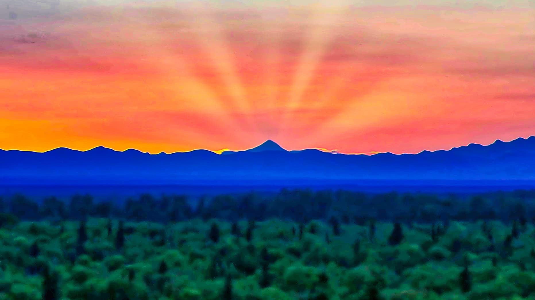 Just before midnight, the sky suddenly ignited with color. From behind Denali’s jagged profile, the sun sent out perfect beams of gold, orange, and crimson—lighting the entire horizon in a display that felt almost unreal. The rays flared upward like the iconic pattern of the Arizona state flag, a connection I didn’t appreciate until reviewing the image later.