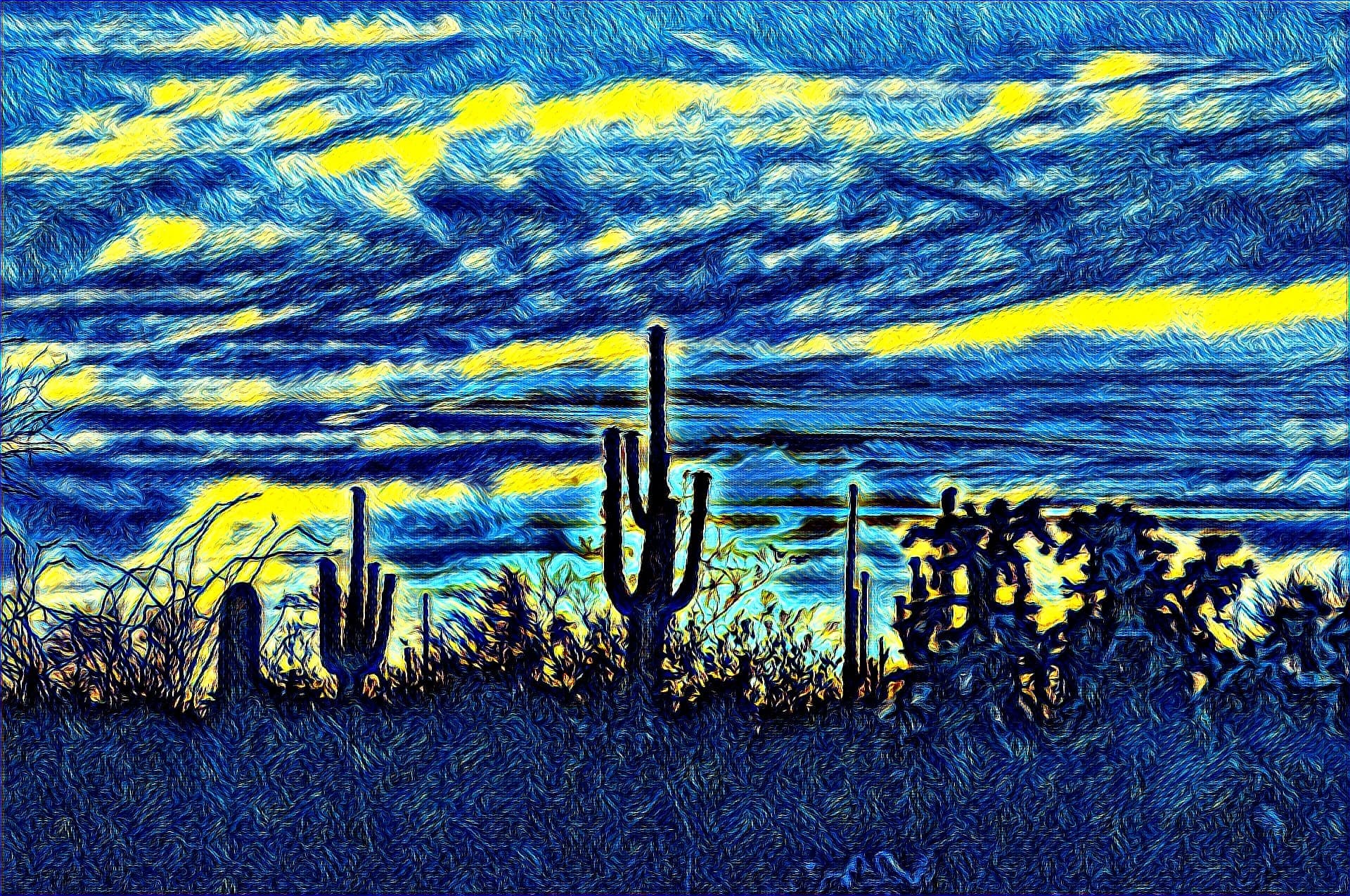 Starry Saguaros reimagines the desert night through bold strokes of color and contrast. Tall cacti rise like sentinels against a sky alive with motion, where streaks of blue and bursts of yellow mimic the rhythm of starlight and shifting clouds. The piece carries echoes of classic, expressionist styles, but with a distinctly Southwestern soulāturning the quiet silhouettes of saguaros into something luminous and cosmic. Itās a vision of the desert as both grounded and infinite, rooted in earth yet reaching for the stars.